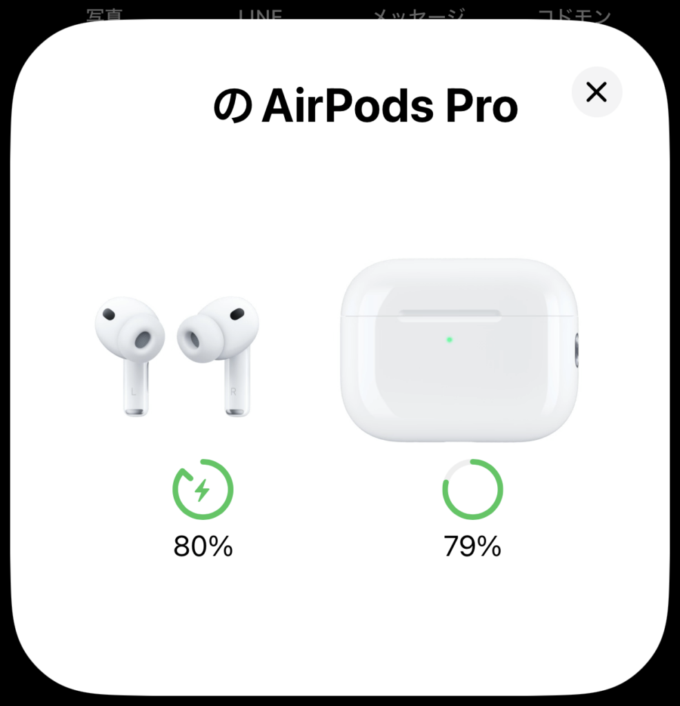 AirPods Pro 3はノイズキャンセリングONで最大8時間、充電ケース併用で最大24時間です(Apple公式仕様、2026年3月確認)。Pro 2の最大6時間から33%向上しています。通勤往復2時間+昼休み1時間の計3時間程度であれば余裕で1日持ちます。ケースに戻して5分充電すれば約1時間分の再生が可能なので、急な会議にも対応できます。
